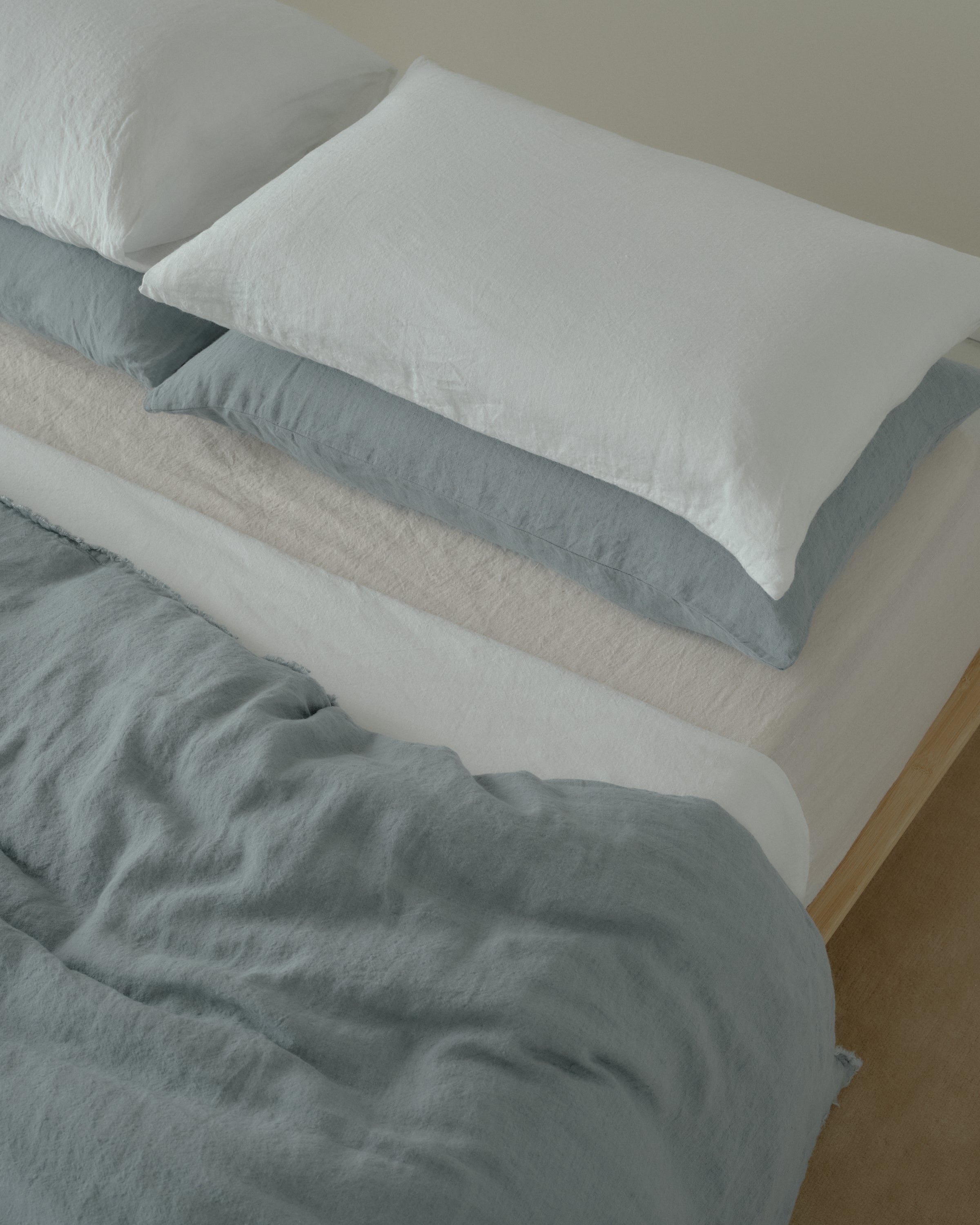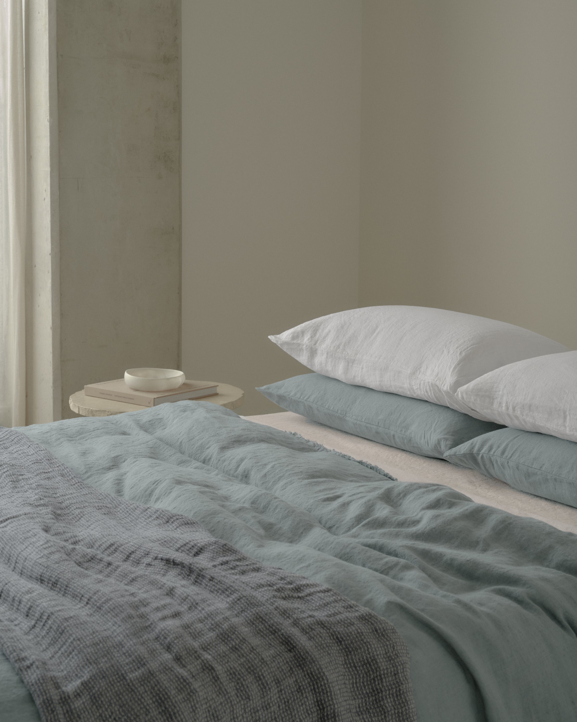 • Cool tones settle across the bed, where depth and light meet in quiet contrast.